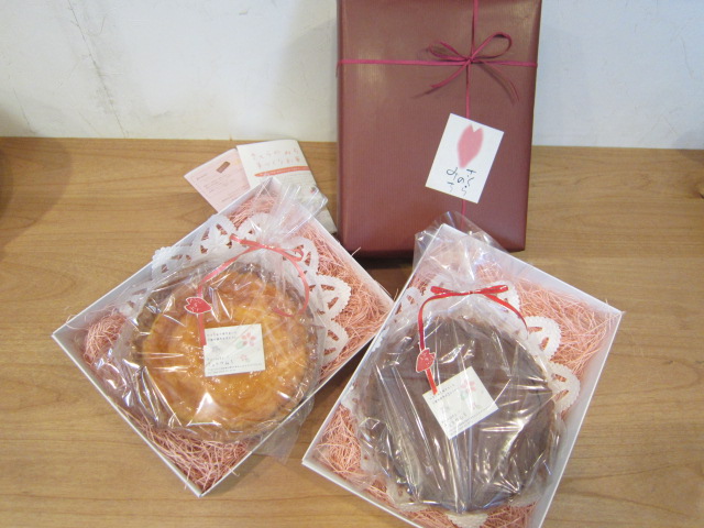 お祝いのお返しにとチョコタルトとチーズタルト2段重ねのご注文。